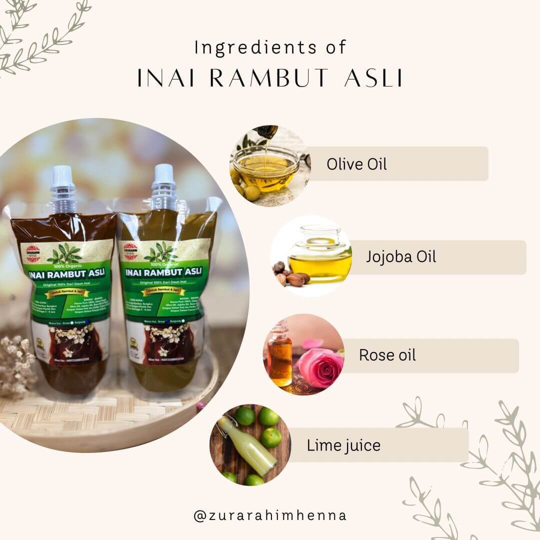 Minyak zaitun extra virgin digunakan untuk memberikan kelembapan pada rambut dan membantu menjadikan rambut lebih lembut dan bersinar. Minyak bunga mawar digunakan untuk memberikan bau yang harum dan menenangkan kulit kepala. Air digunakan untuk membuat campuran inai menjadi pekat dan mudah digunakan. Lime mungkin digunakan untuk membantu mengawal pH campuran inai dan memberikan rasa sejuk pada kulit kepala.